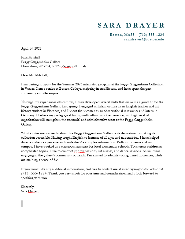 A strong cover letter from an art history student