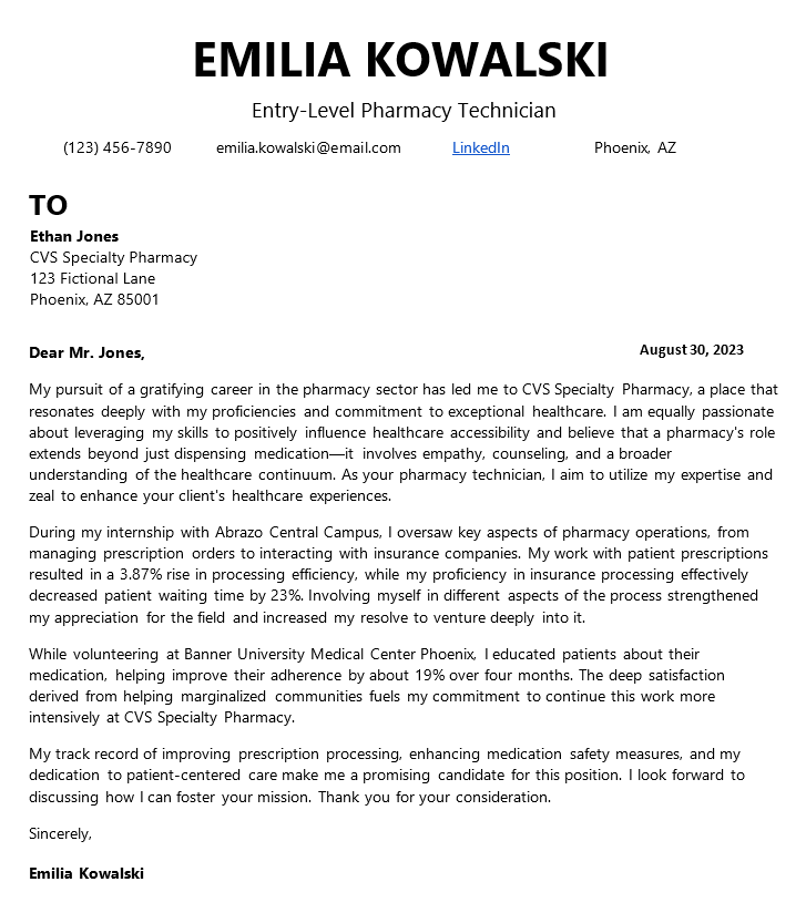 Detail-oriented and motivated entry-level Pharmacy Technician cover letter